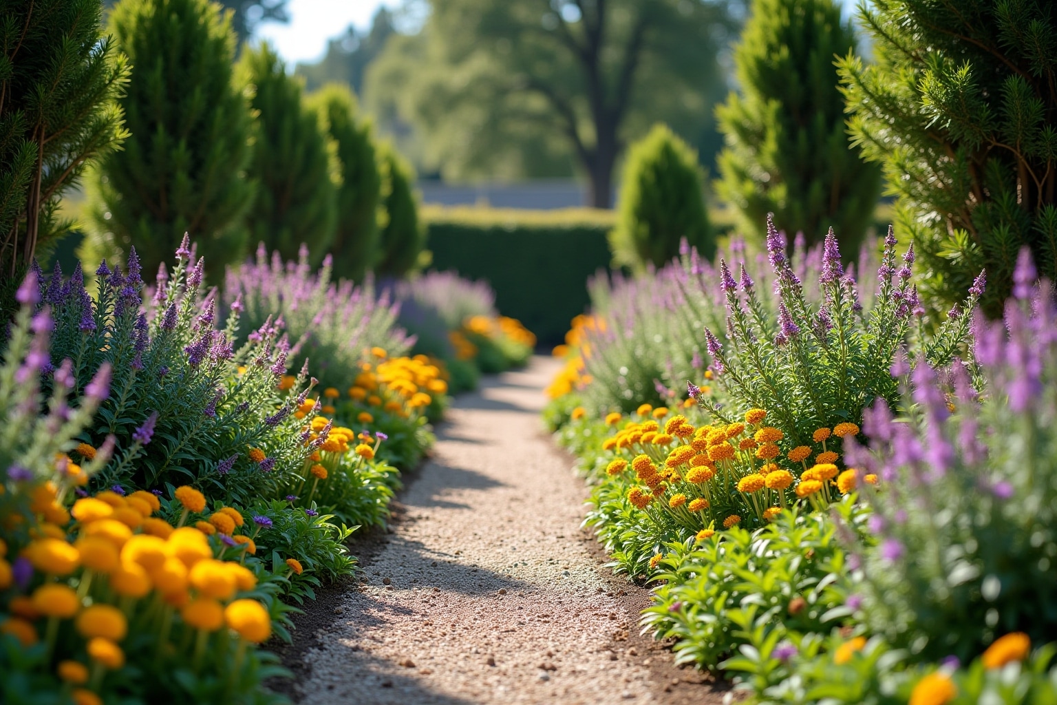 Ein Kräuterbeet ist nicht nur schön anzusehen, sondern auch äußerst nützlich. Kombiniere aromatische Kräuter wie Rosmarin, Thymian, Salbei und Lavendel mit essenziellen Küchenkräutern wie Petersilie, Schnittlauch und Basilikum. Viele Kräuter stammen aus mediterranen Regionen und bevorzugen daher sonnige Standorte und gut durchlässige Böden. Ihre verschiedenen Grüntöne und Blüten bieten eine attraktive Optik.