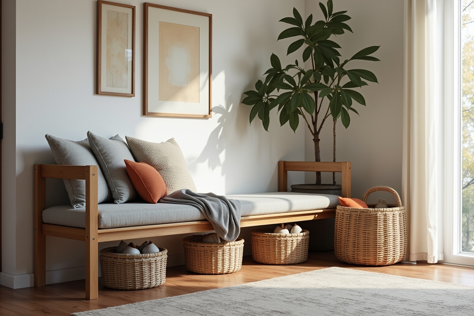 Setze auf helle Hölzer, klare Linien und dezente Polster in Grau-, Blau- oder Beigetönen. Funktionalität und schlichte Eleganz stehen hier im Vordergrund.