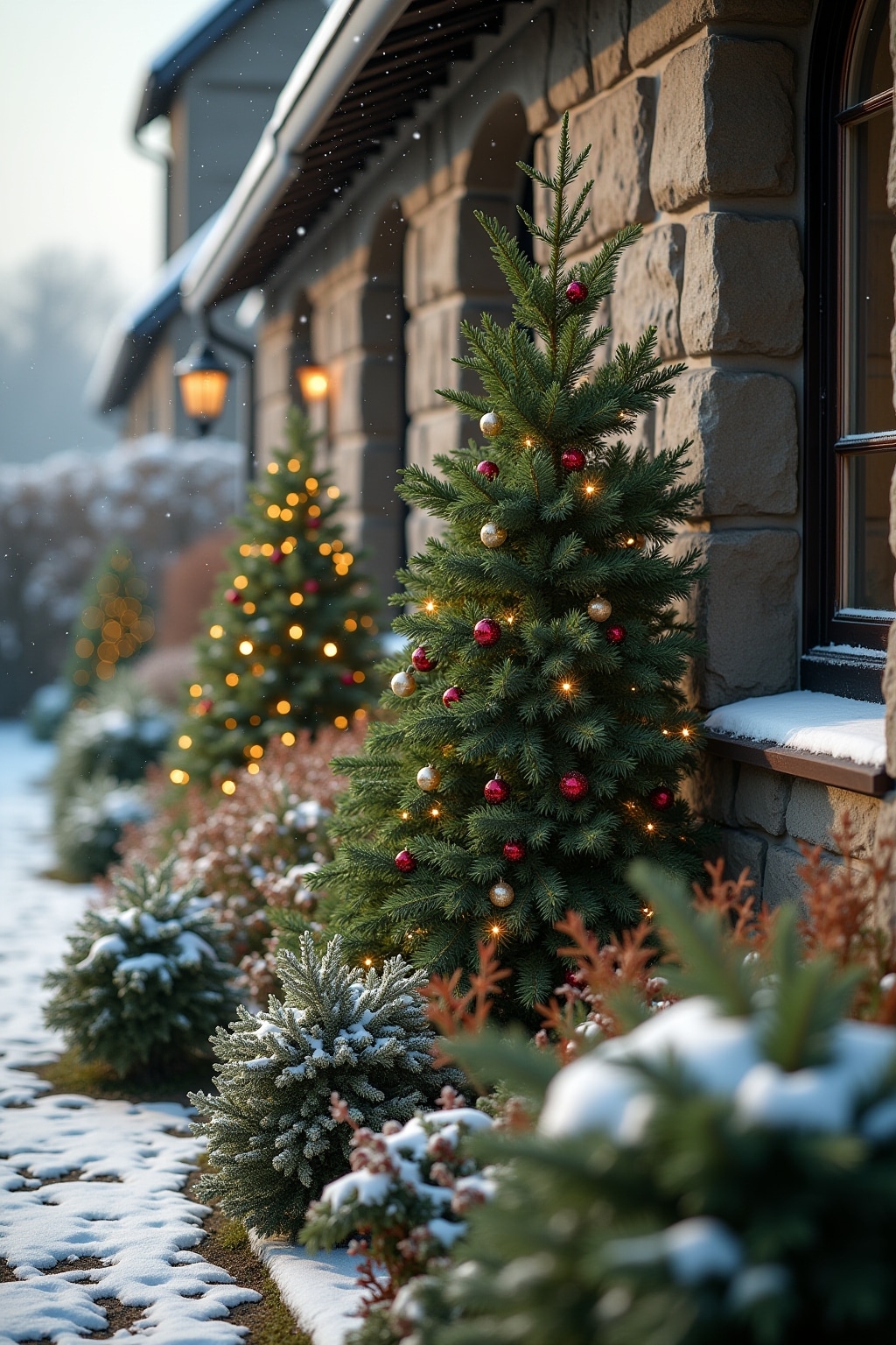 - Vorhandene Gartenpflanzen mit Lichterketten oder Ornamenten weihnachtlich aufwerten.