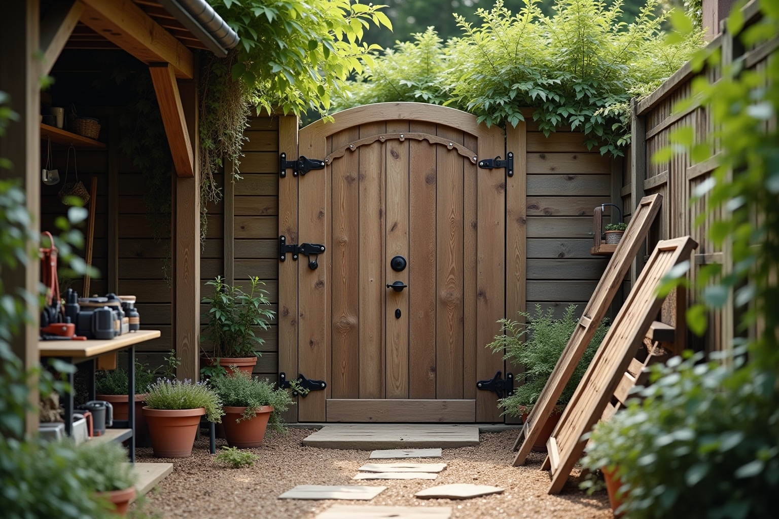 Ein Teil des Tors wird als Rankgitter gestaltet, das von Kletterpflanzen wie Efeu oder Rosen bedeckt werden kann. Dies verbindet Funktion und Ästhetik.