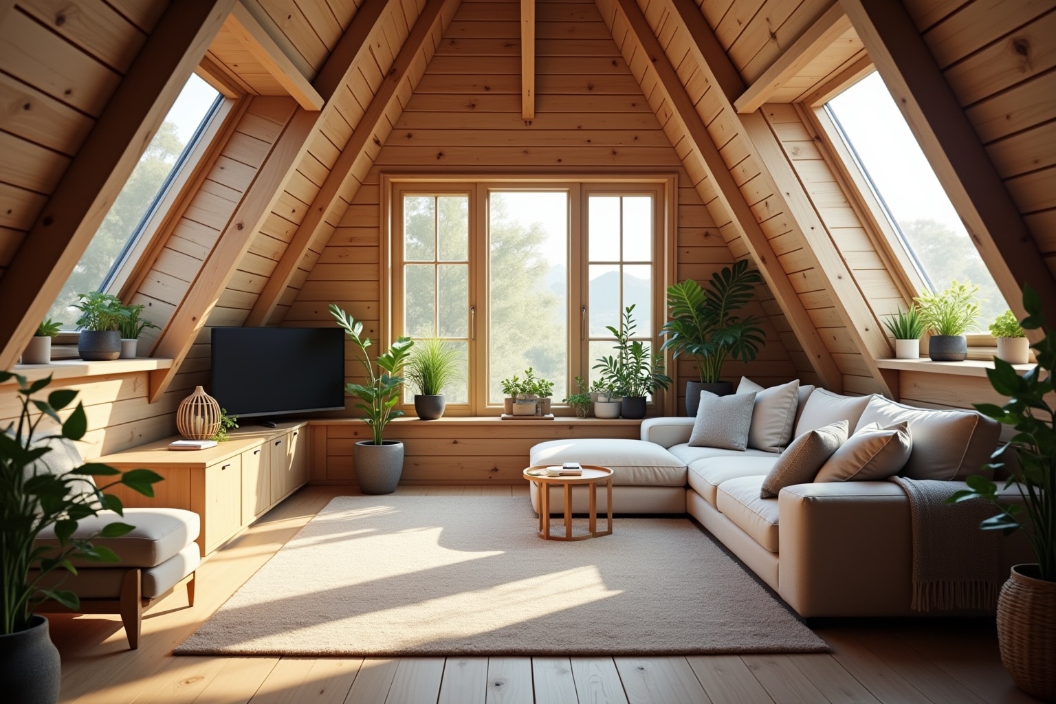 Im Wohnbereich ist Komfort entscheidend. Ein niedriges Sofa oder eine Eckcouch, die sich gut an schräge Wände anpasst, ist eine gute Wahl. Ein Couchtisch mit Stauraum bietet zusätzlichen Nutzen. Niedrige Regale oder wandmontierte Medienmöbel vermeiden, dass der Blick durch zu hohe Objekte verstellt wird. Ein großer Teppich kann den Bereich optisch definieren und Gemütlichkeit schaffen.