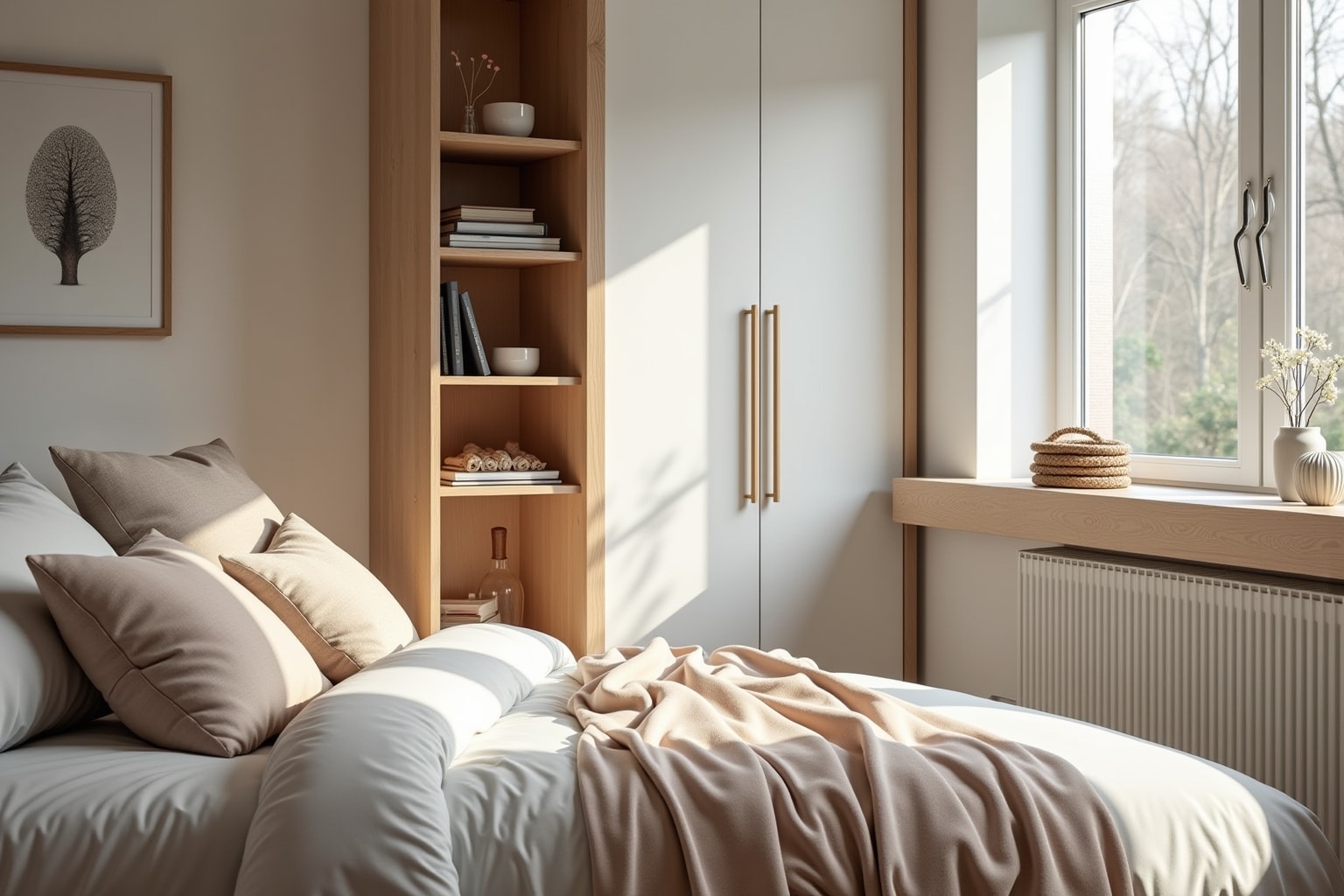 - Wandmontierte Nachttische: Anstatt eines klobigen Nachttisches kannst du schwebende Regale oder kleine Wandkonsolen anbringen. Das wirkt luftiger und erleichtert die Reinigung.
