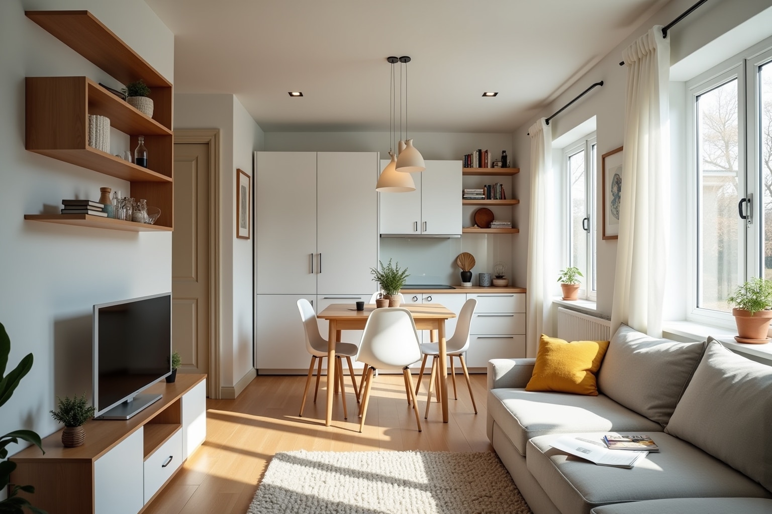 Multifunktionale Möbel sind ideal für kleine Wohnungen. Schlafsofas, Klapptische, Regale bis zur Decke und Hocker mit Stauraum sparen Platz und bieten clevere Lösungen für Stauraum und Flexibilität.